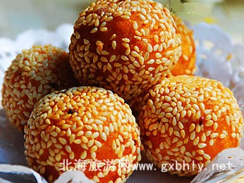 煎堆,外脆里糯,常見(jiàn)會(huì)有芝麻餡、綠豆餡等。這種小吃在南方很多地方都有,北海人非常喜歡吃。