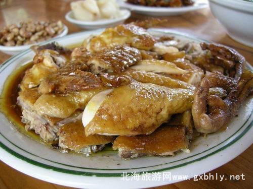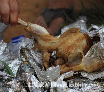 窯雞,傳統(tǒng)做法是用錫紙包好雞跟調(diào)料,放進(jìn)要已經(jīng)燒熱的泥窯里烤,現(xiàn)在很多酒店也有用這道菜。