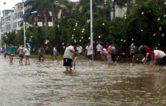 受“蘇拉”殘余云系影響,連日北海普降暴雨、大暴雨。市區(qū)部分路段出現(xiàn)積水內澇現(xiàn)象,其中上海路、西南大道等路段積水明,顯而積水路段拉起了警戒線。而其中湖北路附近的居民卻在積水路段上拉網抓魚。