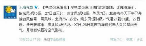 中央氣象臺(tái)26日06時(shí)繼續(xù)發(fā)布臺(tái)風(fēng)藍(lán)色預(yù)警:今年第23號(hào)熱帶風(fēng)暴“山神”(Son-Tinh)于26日早晨在南海中部海面上加強(qiáng)為強(qiáng)熱帶風(fēng)暴,26日05時(shí)其中心位于海南省三沙市東南方大約530公里的海面上,就是北緯14.5度、東經(jīng)116.6度,中心附近最大風(fēng)力10級(jí)(25米/秒),中心最低氣壓為988百帕。