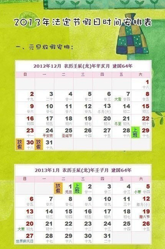 剛剛?cè)攵,就有網(wǎng)友忍不住制作了2013年節(jié)假日時間安排表,有網(wǎng)友說“就看到了明年的希望”。元旦、春節(jié)、清明節(jié)、勞動節(jié)、端午節(jié)、中秋節(jié)和國慶節(jié)的假期網(wǎng)友們已經(jīng)給你模擬出了,下面為您倒騰了兩份休假方案,結(jié)合年假,周末和法定節(jié)假日。出國旅游?時間完全木有問題!