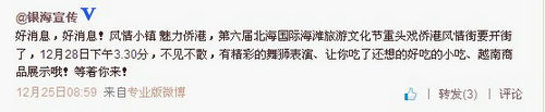 來自北海銀灘宣傳微博12月25日的信息,第六屆北海國(guó)際海灘旅游文化節(jié)重頭戲僑港風(fēng)情街將于12月28日下午3.30分開街了,屆時(shí)不僅會(huì)有精彩的舞獅表演,還會(huì)有美味的小吃、越南商品展示。到30日結(jié)束,活動(dòng)歷時(shí)3天!本次活動(dòng)結(jié)束后風(fēng)情街仍正常開業(yè)經(jīng)營(yíng)。