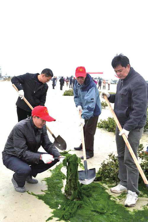 200多名來自銀灘鎮(zhèn)機(jī)關(guān)和市海洋局機(jī)關(guān)的工作人員,拿著鐵鍬、掃帚等工具,有的在清掃海灘上的垃圾,有的在小心翼翼地除掉掛在紅樹林上面的布條和垃圾袋……據(jù)介紹,此次活動(dòng)是銀灘大冠沙紅樹林環(huán)境清理修復(fù)工作的一部分,該活動(dòng)從去年9月份開展,目前已收到了良好的效果。主辦單位希望通過這次活動(dòng),使更多市民意識(shí)到保護(hù)銀灘環(huán)境的重要性,不要在游玩的時(shí)候隨便丟垃圾。