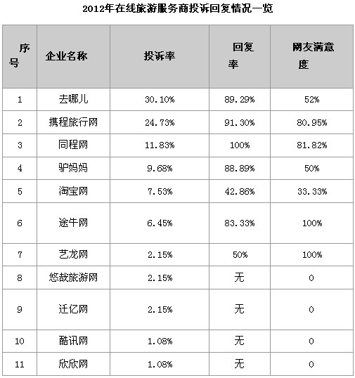 人民網(wǎng)北京3月15日電 ,根據(jù)人民網(wǎng)旅游3·15投訴平臺的數(shù)據(jù),對2012年在線旅游服務(wù)商投訴回復(fù)情況進(jìn)行了統(tǒng)計,其中投訴比例最高的為去哪兒網(wǎng),達(dá)到30.1%,緊跟其后的是攜程旅行網(wǎng),達(dá)到24.73%,同程網(wǎng)排名第三,達(dá)到11.83%,成為在線旅游服務(wù)商投訴最多的前三名。此外,根據(jù)排行榜中的數(shù)據(jù)顯示,同程網(wǎng)和攜程旅行網(wǎng)的投訴回復(fù)率較高,而同程網(wǎng)回復(fù)率達(dá)100%。
