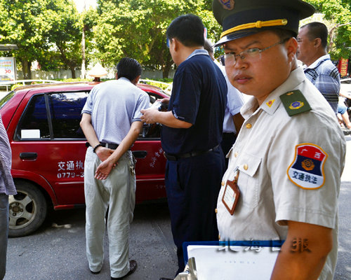 在經(jīng)過對司機(jī)的廣泛宣傳教育后,6月7日上午,北海市十家出租車公司、市交通綜合執(zhí)法支隊聯(lián)合采取行動,分別在云南路水產(chǎn)市場、天外天飯店門前等地設(shè)點(diǎn),突擊檢查出租車是否打表經(jīng)營、有無拒載等違章行為,十家出租車公司董事長、總經(jīng)理悉數(shù)參加行動。