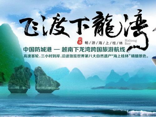 中國防城港¬—越南下龍海上旅游航線,是中國國家旅游局批準的中越邊境跨國黃金旅游線路,集人文景觀和自然風(fēng)光于一體,歷史上承載著兩國傳統(tǒng)友誼的著名“海上胡志明小道”即為這條線路的前身。該航線貫穿中國防城港江山半島省級旅游度假區(qū)、京島省級風(fēng)景名勝區(qū)、世界自然遺產(chǎn)越南下龍風(fēng)景區(qū),80%時間航程在“世界第八奇跡——下龍灣”景區(qū)內(nèi),島嶼眾多,山水優(yōu)美,人文景觀獨特,游客可觀賞到靚麗的異國海島風(fēng)光和神秘的異國民俗風(fēng)情,被譽為“全球最美跨國海上旅游航線”,也是中國通往越南下龍灣航程最短、最安全、最舒適、最高品質(zhì)的海上跨國旅游航線。
