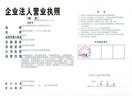 北海環(huán)球國(guó)際旅行社有限責(zé)任公司是經(jīng)國(guó)家旅游局批準(zhǔn)成立的具有出境游資格的一類國(guó)際旅行社,已足額交納旅游質(zhì)量保證金170萬元,主營(yíng):入境旅游業(yè)務(wù)、出境旅游業(yè)務(wù)、邊境旅游業(yè)務(wù)、國(guó)內(nèi)旅游業(yè)務(wù)四大旅游業(yè)務(wù),是北海目前規(guī)模最大、綜合實(shí)力最強(qiáng)的國(guó)際旅行社之一(國(guó)際旅行社經(jīng)營(yíng)許可證號(hào):L-GX-CJ00037)。