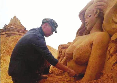 記者在現(xiàn)場看到,這些沙雕造型各異,栩栩如生,底部都用木制框架固定了起來。記者了解到,沙雕造型易散,在雕刻前要用模固定起來,加水以定形,十分考驗藝術(shù)家的功力。
