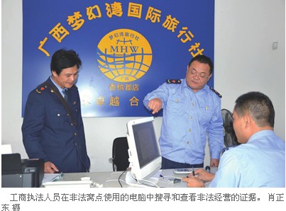 11月19日下午,市旅游整規(guī)辦組織旅游、工商、公安等部門聯(lián)合執(zhí)法,對(duì)位于上海路香檳郡一樓的子虛烏有的“廣西夢(mèng)幻灣國(guó)際旅行社”和位于站前路國(guó)際新城一樓,擅自打著未經(jīng)允許、假冒他人之名的“廣西商務(wù)國(guó)際旅行社國(guó)際新城營(yíng)業(yè)部”進(jìn)行了突擊查處。
