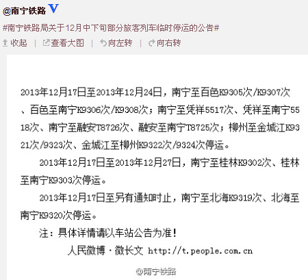 根據(jù)運(yùn)行圖,旅客除了要適應(yīng)新增的列車外,也要留意部分停運(yùn)列車和長期臨客的車次。包括:停運(yùn)南寧-梧州K9326/7 K9328/5次1對,南寧-桂林T8722/1、K9302/3次2對;停運(yùn)防城港-南寧7322/1次1對;停運(yùn)臨時圖定客車南寧-柳州L9328/7次1對;還有停運(yùn)臨時圖定客車長沙-賀州2901/2次1對。