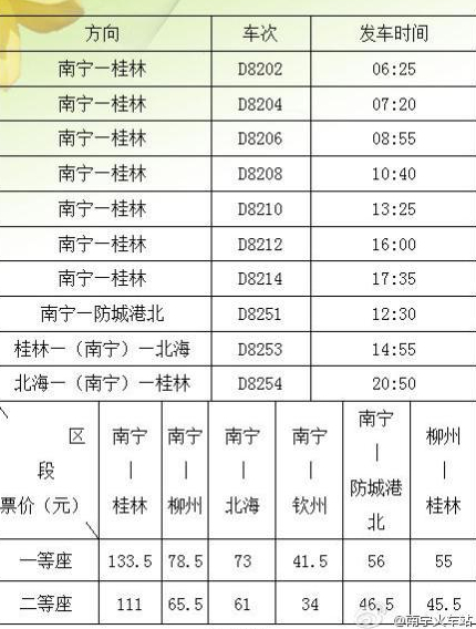 據(jù)悉,從北;疖囌景l(fā)出的北!鹆质琢休d客動(dòng)車D8254,將于30日19:10分發(fā)車,20∶31分到達(dá)南寧、22∶24分到達(dá)柳州、23∶29分到達(dá)桂林。當(dāng)天桂林~北海發(fā)車時(shí)間為11∶55,16∶18到達(dá)北海。南寧至北海動(dòng)車一等座73元、二等座61元;柳州至北海動(dòng)車一等座144元、二等座119.5元;桂林至北海動(dòng)車一等座198.5元、二等座166元。