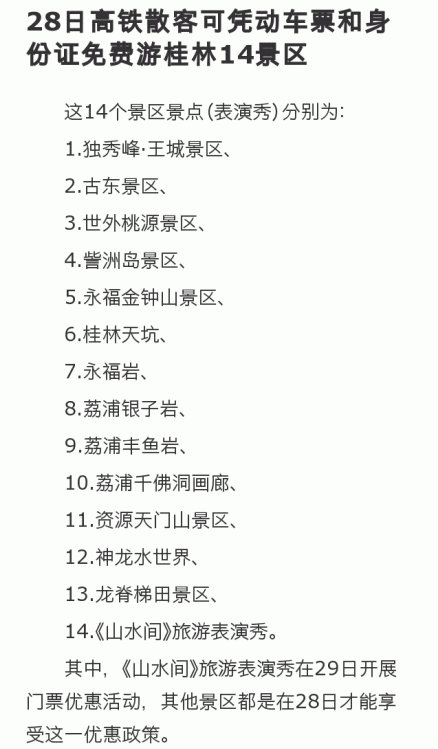 另外,值得注意的是高鐵開(kāi)通在即,旅游部門(mén)紛紛啟動(dòng)『高鐵營(yíng)銷』模式。12月28日零時(shí)至24時(shí),搭乘高鐵動(dòng)車來(lái)桂林的散客都可在28日當(dāng)天,憑本人動(dòng)車票和身份證,在桂林14個(gè)景區(qū)景點(diǎn)(表演秀)享受門(mén)票免費(fèi)的優(yōu)惠政策。