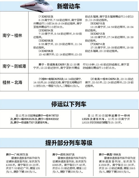 當(dāng)代生活報(bào)訊 昨日,記者從南寧火車(chē)站獲悉,火車(chē)站從12月28日零時(shí)起調(diào)整列車(chē)運(yùn)行圖,新增開(kāi)了動(dòng)車(chē),并停運(yùn)部分列車(chē)和增加或取消部分車(chē)站,還有部分普通快速旅客列車(chē)升級(jí)為空調(diào)快速旅客列車(chē)。