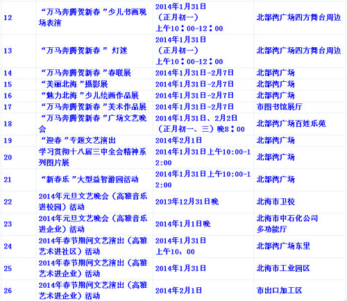 近日,北海政府網(wǎng)發(fā)布了《北海市2014年元旦春節(jié)文體活動安排表》,北海市文化部門在2014年元旦春節(jié)期間,開展很多形式多樣、內(nèi)容豐富多彩的文體活動,有興趣的游客朋友不妨去看看哦~