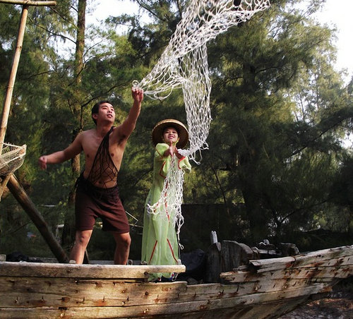 在疍家婚禮巡演中,由“男方家”沿著指定路線前往“女方家”疍家棚,接著“坐艇”前往“拜堂”,期間有美妙的疍家民謠、咸水歌表演。在長廊門口的疍家迎賓女,身穿疍家服飾迎接嘉賓、游客等參觀疍家風(fēng)情長廊并講解。最后是疍家女民兵巡演及歡樂體驗拉大網(wǎng)捕魚活動。