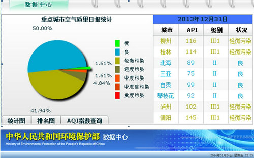 北海與三亞空氣質(zhì)量級(jí)別均為II級(jí),狀況為良。廣西的其他兩個(gè)城市柳州、桂林也在環(huán)保部監(jiān)控的74個(gè)城市范圍內(nèi)。北海、桂林、柳州三個(gè)城市12月份空氣質(zhì)量狀況:北海2天優(yōu),26天良,2天輕微污染。