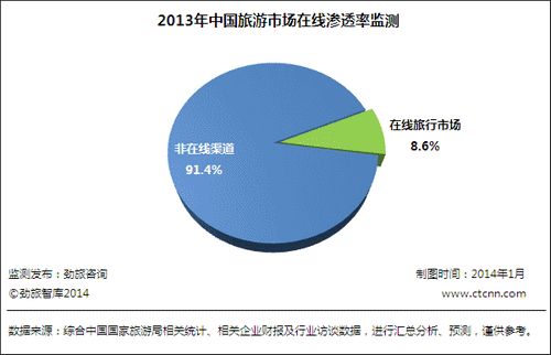 2013年,中國(guó)旅游市場(chǎng)總交易額約為29475億元,其中在線渠道交易額約為2522億元,中國(guó)旅游市場(chǎng)在線滲透率為8.6%。