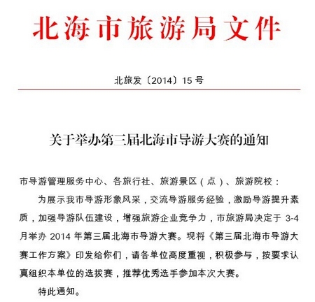 (北海旅行社訊)來自北海旅游局官網(wǎng)的消息,北海市將于三四月舉辦2014年第三屆北海市導游大賽。屆時北海市各大旅行社、旅游景區(qū)、旅游院校將會紛紛投入角逐,精彩紛呈。我們也期待著北海環(huán)球國旅的各位優(yōu)秀導游們再創(chuàng)佳績!