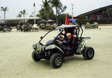 出了漂亮的新太陽傘,還有刺激有趣的沙灘車頗受游客歡迎,一名女游客帶著小朋友駕駛沙灘車在潔白的沙灘上開心娛樂,北海旅行社提醒游客朋友游玩時一定要注意安全喲。