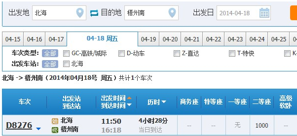 桂林-北海D8259次,桂林14:45始發(fā),柳州15:47/15:57,南寧17:40/18:00,欽州東18:54/18:56,北海19:33終到。