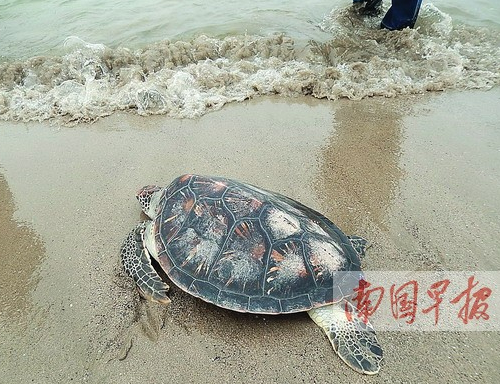 對此,北京市農(nóng)業(yè)局副局長李全錄直言不諱:“山東、廣東近海作業(yè)繁忙,海洋環(huán)境受到一定影響,為了放流海洋動物的安全和健康,我們不再選擇那里。廣西北部灣海域海水較為潔凈,各種海洋資源豐富,而且本來就有海龜分布,放生到這里有利于它們的生長、繁衍!彼H眼見識到北海潔白的沙灘、清澈的海水后,不禁感慨;“北部灣海域的海水真好,這兩只小海龜真幸福!”