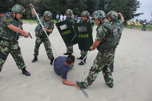 演習現(xiàn)場模擬兩名歹徒在銀灘景區(qū)持刀砍殺游客,景區(qū)管理人員及救生隊員發(fā)現(xiàn)后迅速報警,在警察趕到之前用木棍等工具把歹徒逼到海邊死角,形成合圍狀態(tài),景區(qū)醫(yī)務人員迅速救治受傷群眾。公安干警趕到現(xiàn)場后使用各種防暴裝備制服歹徒。