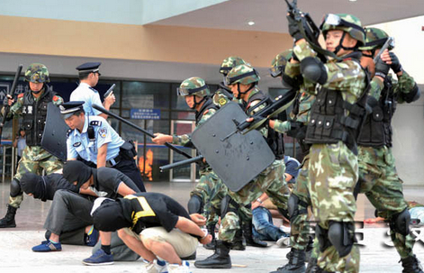現(xiàn)場模擬在人流密集的火車站出站口,“6名恐怖分子”開兩輛越野車沖撞北海火車站的護欄,試圖沖進候車室碾壓旅客,由于護欄結(jié)實沒法撞開,“恐怖分子”下車后向旅客投擲爆炸物,多名“暴徒”持棍和刀斧突然從附近沖出,砍殺無辜旅客,造成旅客傷亡,車站進站口著火。由于火車站是市公安局部署的“一分鐘處置”重點區(qū)域,現(xiàn)場屬地分局武裝巡邏車組、武警徒步巡邏組和鐵路公安武裝突擊組僅用50秒鐘便到達中心現(xiàn)場,對其中6名“暴徒”進行果斷處置,分別將“歹徒”擊傷、擊斃、抓獲……