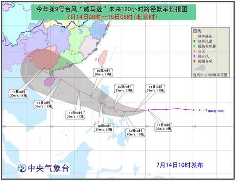 預(yù)計,“威馬遜”將以每小時25公里左右的速度繼續(xù)向偏西方向移動,強度逐漸加強,最強可達(dá)臺風(fēng)級(12-13級,35-40米/秒)!巴R遜”有可能于16日凌晨登陸菲律賓呂宋島東部沿海,16日下午至夜間進(jìn)入南海東部海面。14-15日,“威馬遜”對我國海域無影響。