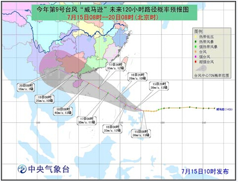 預(yù)計,“威馬遜”將以每小時20-25公里的速度向偏西轉(zhuǎn)西偏北方向移動,將于今天下午到傍晚在菲律賓中部沿海登陸,預(yù)計登陸強度為12-13級(35-40米/秒),傍晚到夜間穿過菲律賓中部,強度將明顯減弱;明天(16日)下午至夜間“威馬遜”將進入南海東部海面,以后逐漸向南海西北部海面靠近,強度還將再次加強。
