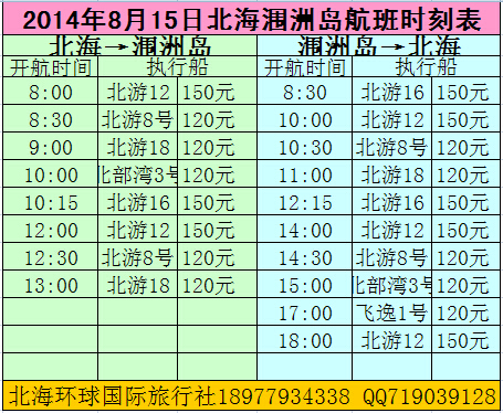 2014年8月15日北海潿洲島航班安排如下: