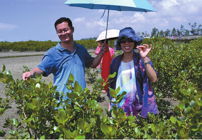 兩名外地游客在金海灣紅樹林里采摘欖錢。