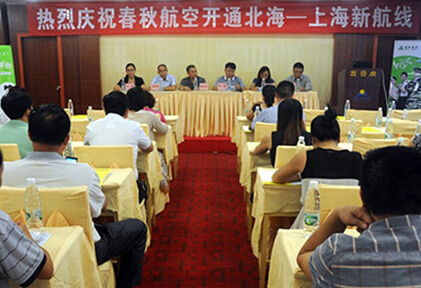 據(jù)報(bào)道,24日上午,春秋航空開通北海至上海新航線通氣會在北海中玉大酒店順利召開,北海市旅游局副局長李軍、市場科科長林小玲、北海機(jī)場管理公司總經(jīng)理周衛(wèi)東等出席了此次會議。