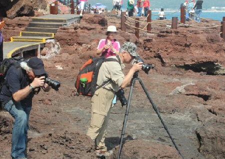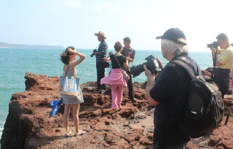 11月5日,秋日里的潿洲島天氣晴朗,綠樹環(huán)繞的島嶼更顯秀美壯麗。攝影家們不顧遠(yuǎn)道的疲勞,他們被潿洲島的景觀深深吸引,在鱷魚山公園、五彩灘、天主教堂,大家紛紛舉起各自手中的“長槍短炮”,選取角度,認(rèn)真構(gòu)圖,記錄下這最美的瞬間。