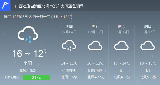 受強冷空氣影響,北部灣海面:今天,陰天有小雨,偏北風(fēng)5~6級,陣風(fēng)7級;4日,陰天有小雨,偏北風(fēng)6~7級,陣風(fēng)8到9級。北海港和潿洲島各臺風(fēng)警報站所掛強風(fēng)信號一號風(fēng)球不改變。由于海面風(fēng)浪減弱,今天潿洲島航班開通一班往返潿洲島的航班,滯留島上的朋友可以考慮選擇回市區(qū),而計劃上島的游客朋友還需要謹慎。