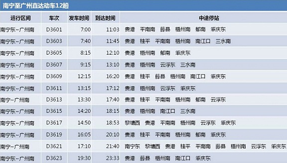 12月26日,南廣高鐵、貴廣高鐵和南寧東站“雙線一站”同日開通使用!而南寧-廣州的動車班次和票價(jià)首次曝光!南寧-廣州二等座動車票價(jià)為171元!南寧-廣州每天12趟動車,從早上7點(diǎn)整,至晚上7點(diǎn)半,每天有12趟南寧-廣州動車,幾乎每小時(shí)一趟。