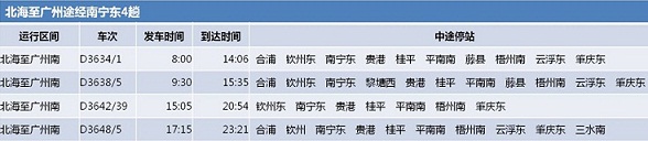 北海-廣州動車4趟中有3趟經(jīng)過合浦,而最快的是15:05發(fā)車的D3642/39動車,途經(jīng)7個(gè)站,不過合浦,20:54到達(dá),車程5小時(shí)49分鐘。