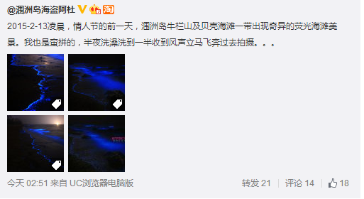 2015年2月13日凌晨,也就是今天,據(jù)島民和游客反映潿洲島牛欄山及貝殼海灘一帶出現(xiàn)奇異的熒光海灘美景,不少游客有幸親身目睹了這一奇妙的景觀。