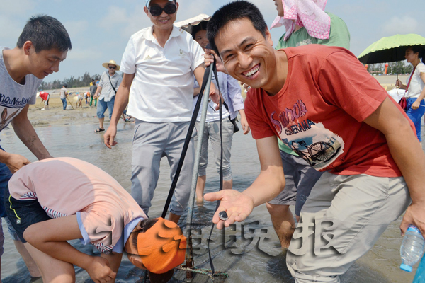 “知道有挖螺大賽后,我們?nèi)叶际峙d奮,早早就開始做好了參賽的準(zhǔn)備!笔忻駝⑾壬鷮τ浾哒f,自己小時候經(jīng)常跟隨父母到海邊挖螺,長大后就沒有挖過了,F(xiàn)在帶著自己的孩子挖螺,自己又找回了童年的感覺。