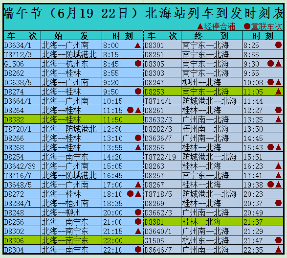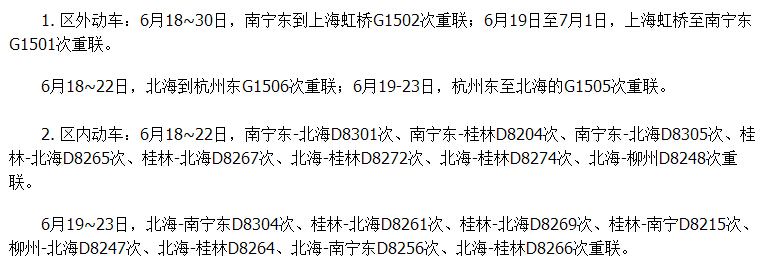 端午節(jié)(6月19-22日)南寧鐵路局將在北海方向增開多趟動車、現(xiàn)有部分動車重聯(lián),具體如下