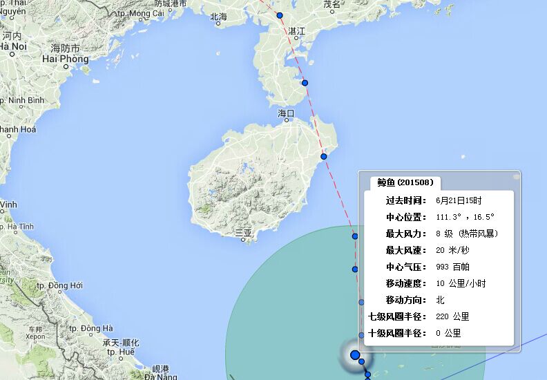 今年第8號(hào)臺(tái)風(fēng)“鯨魚(yú)”于今天(21日)上午11點(diǎn)鐘在南海中部海面上生成。逐漸向海南東部至廣東西部沿?拷,并將于22日夜間到23日白天在海南東部至廣東西部沿海登陸,預(yù)計(jì)登陸時(shí)強(qiáng)度為熱帶風(fēng)暴級(jí)(中心最大風(fēng)力8~9級(jí))臺(tái)風(fēng)將帶來(lái)較強(qiáng)降雨。