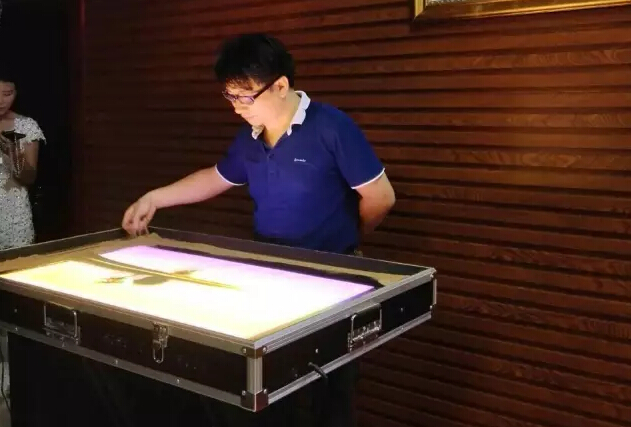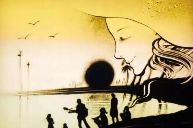 沙畫藝術(shù)是21世紀(jì)剛剛興起的一種與舞臺(tái)藝術(shù)相結(jié)合的表演形式,最早由來自匈牙利的世界著名沙畫大師弗蘭克•庫科所創(chuàng)造。它是指在白色背景板上現(xiàn)場用沙子作畫,并結(jié)合音樂通過投影展現(xiàn)在屏幕上。(via北海電視臺(tái))