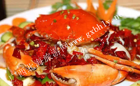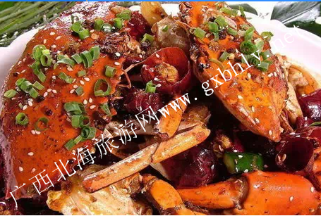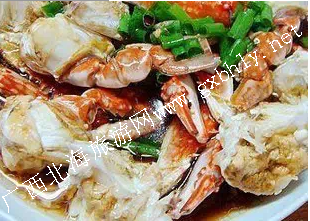 ③鍋內(nèi)另加油,燒至四成油溫,投入干辣椒節(jié),花椒炒香,摻入鮮湯,略燒片刻,再下姜、蔥蒜、海蟹,最后放入精鹽、料酒、海鮮醬、雞精燒約2分鐘后,用水淀粉收薄芡,最后加入香油、花椒油、辣椒油、胡椒粉翻勻即可裝盤。