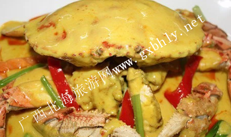 ③起油鍋炒香洋蔥絲,再加入b料以小火炒出咖喱香味后,到入1杯水與螃蟹一同干燒,燒至湯汁快收干時勾薄芡。