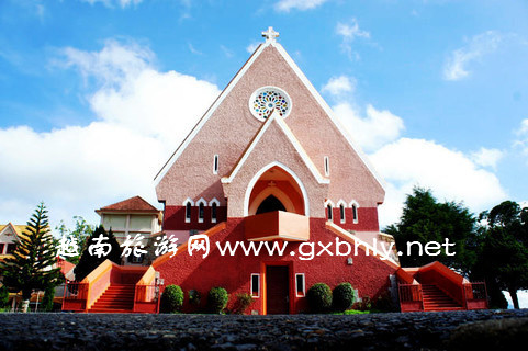 建于1923年,法國統(tǒng)治時期的天主教堂,以其高大鐘塔上的風(fēng)向標(biāo)為標(biāo)志,又被稱作雄雞教堂,是越南中部最大的西方教堂。中世紀(jì)風(fēng)格的彩繪大玻璃窗與粉紅色的外觀相映成趣,鮮明可愛。周日有彌撒,可以進(jìn)去參觀。