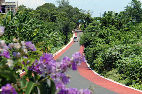 然后就可以租個電瓶車,慢慢悠悠開在彩色公路上看看四周的風(fēng)景……彩色公路。這條道路上有兩種不同的顏色,所以被島上的人稱為彩色公路。其實它也是環(huán)島路的其中一段,路的兩邊都是大片大片的香蕉林。