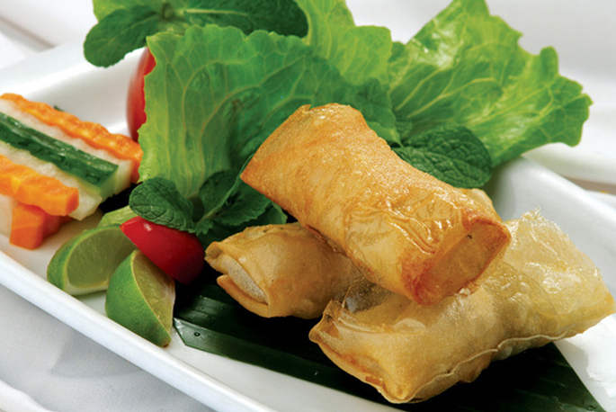 春卷是越南人最喜愛(ài)的一種小吃,和國(guó)內(nèi)的做法相同,味道也各有特色。河內(nèi)的春卷皮用糯米做成,潔白透明、薄如蟬翼。用春卷皮把由豆芽、粉絲、魷魚(yú)絲、蝦仁、蔥段等做成的餡裹在里面,放入油鍋中炸至酥黃。食用時(shí)用生菜葉裹在外面,再蘸上魚(yú)露或酸醋、辣椒等佐料,酥脆不膩,美觀爽口。
