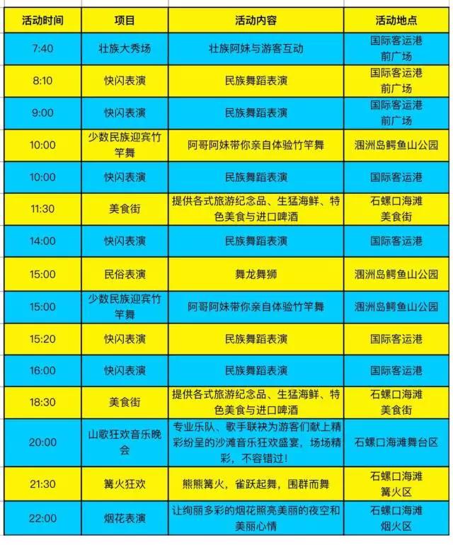白天有山歌迎(送)客、民族舞蹈快閃表演、竹竿舞體驗、腰鼓舞表演、北海民俗表演、天主教堂唱詩班表演以及北海特色美食體驗等;晚上有互動狂歡音樂晚會、萬人篝火、煙花表演及海鮮美食街等,為游客奉送一場無與倫比的“三月三”民俗盛宴。