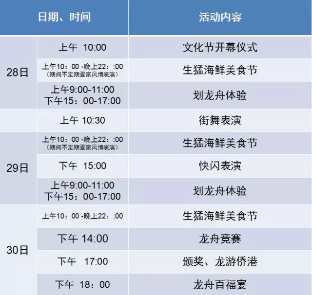 5月28日、29日兩天,市民游客可親身體驗(yàn)劃龍舟,與僑港人民一起競(jìng)渡風(fēng)情僑港。每艘龍船每次可接待10名游客,根據(jù)當(dāng)?shù)仫L(fēng)俗習(xí)慣,女士上鳳艇,男士上龍舟。鳳艇有專門(mén)人士劃行,女士可搭乘鳳艇伴龍舟一起出行,為體驗(yàn)?zāi)惺考佑椭。?duì)于許多北海人來(lái)說(shuō),精彩的龍船表演只是一道“開(kāi)胃菜”,而另一場(chǎng)重頭戲已經(jīng)悄悄拉開(kāi)了序幕.....那就是百福宴“龍舟飯”。精挑細(xì)選的食材,極具僑港美食特色。有龍舟飯必備的龍舟酒,燒豬等。
