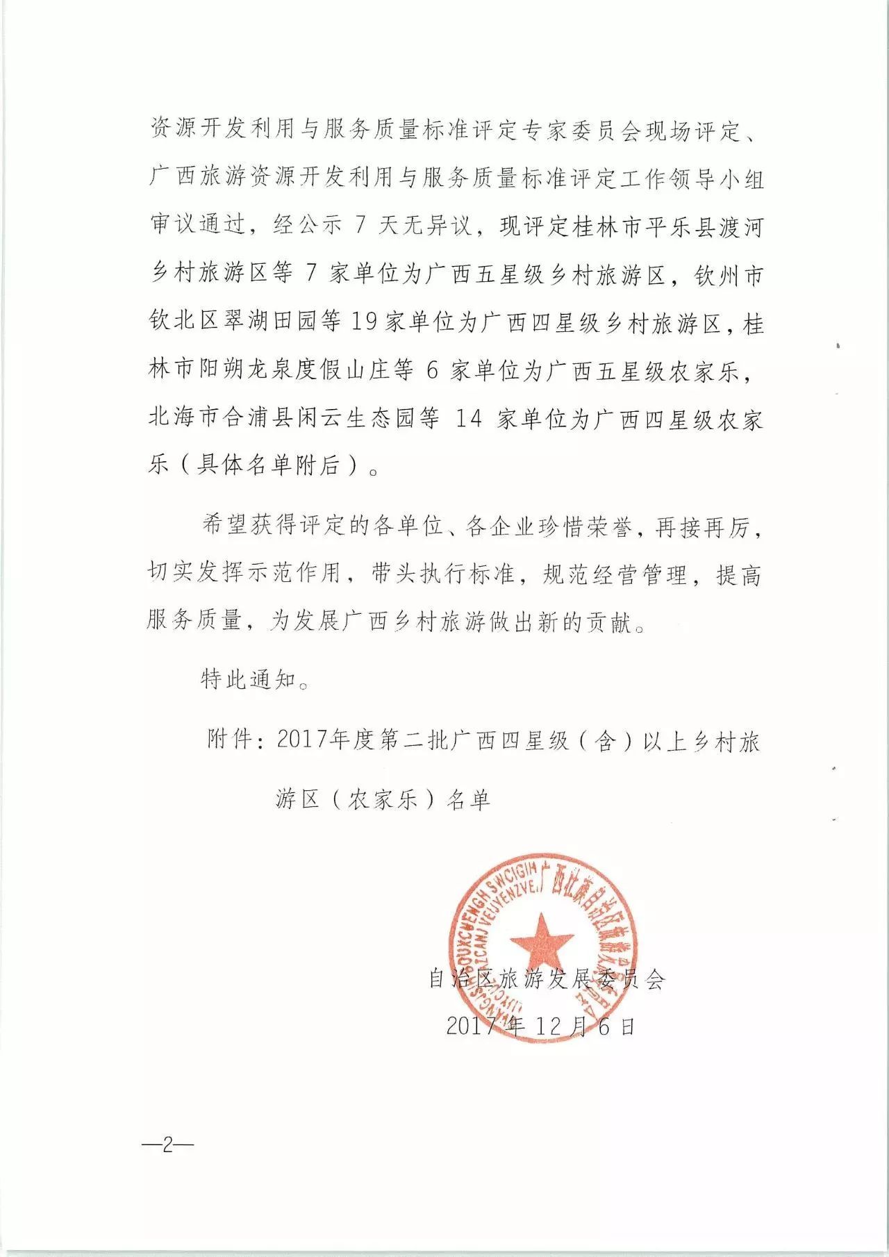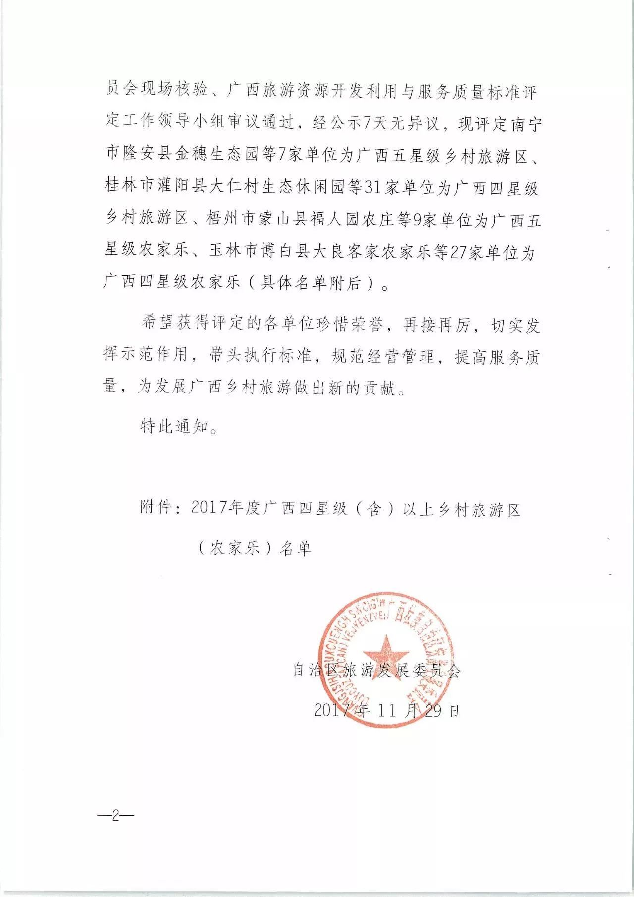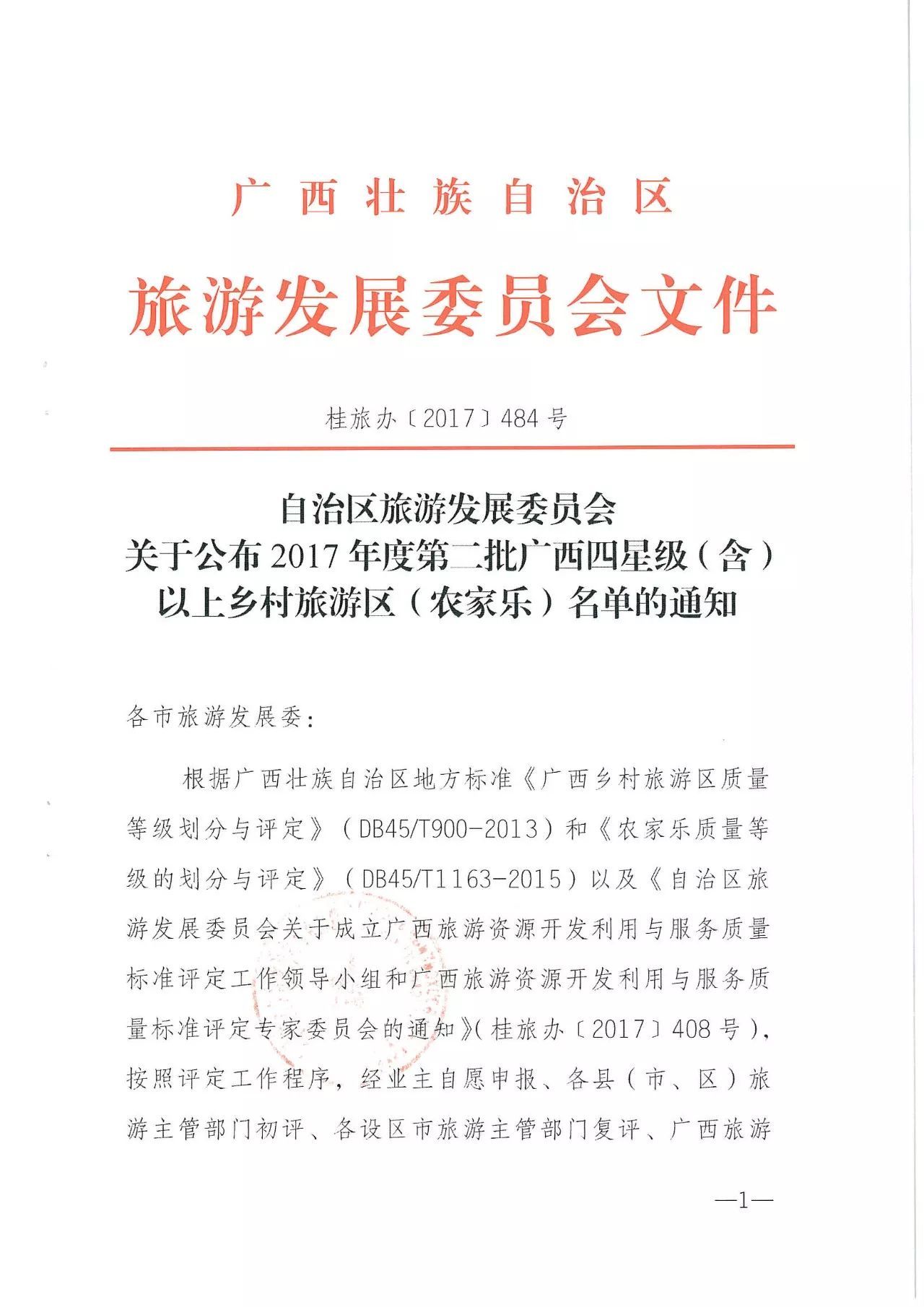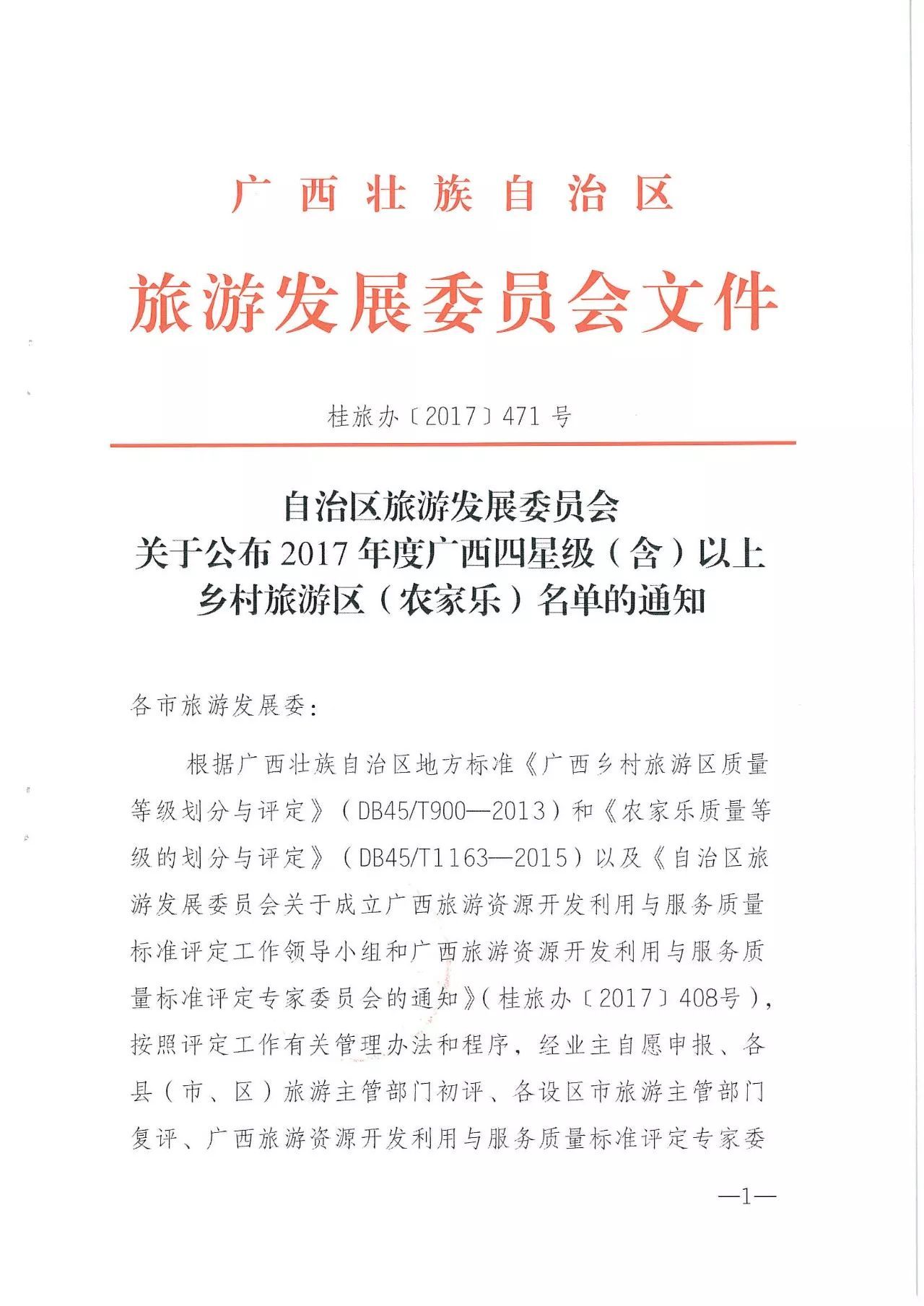 2017年度廣西四星級(含)以上鄉(xiāng)村旅游區(qū)(農家樂)名單是根據(jù)廣西壯族自治區(qū)地方標準《廣西鄉(xiāng)村旅游區(qū)質量等級劃分與評定》(DB45/T900—2013)和《農家樂質量等級的劃分與評定》(DB45/T1163—2015)以及《自治區(qū)旅游發(fā)展委員會關于成立廣西旅游資源開發(fā)利用與服務質量標準評定專家委員會的通知》(桂旅辦〔2017〕408號),按照評定工作有關管理辦法和程序,經業(yè)主資源申報、各縣(市、區(qū))旅游主管部門初評、各設區(qū)市旅游主管部門復評、廣西旅游資源開發(fā)利用與服務質量標準評定專家委員會現(xiàn)場核驗、廣西旅游資源開發(fā)利用與服務質量標準評定工作領導小組審議通過。