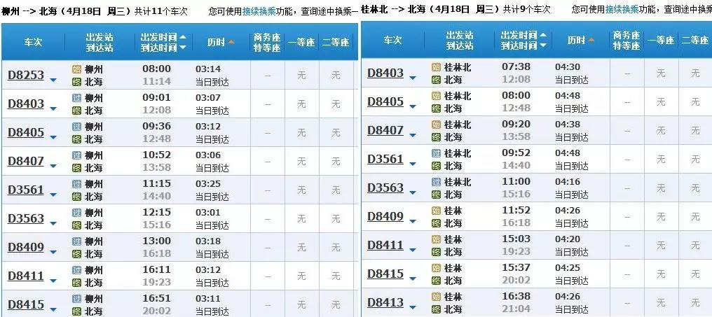 4月18日,桂林、柳州至北海動車查詢-12306官網(wǎng)截圖